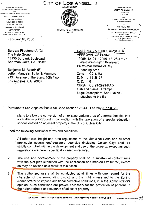 4. Hopefully, either revoke the zoning permit your office has issued The Help Group, or impose additional corrective conditions (e.g. ban part of the parking lot from playground use), which you are entitled to do under L.A. Municipal Code 12.24-G, Z & AA.